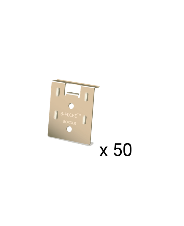 De B-fix Border wordt verkocht in een doos met 5 zakken van 10 B-fix Border, 10 zelfborende schroeven en een montageplan. Met dezelfde mechanische eigenschappen als de B-fix One, biedt de B-fix Border de mogelijkheid aan om de eerste en laatste B-fix Border terrasplanken op de onderbalk te fixeren. Het aanleggen van B-fix Border is gemakkelijker dankzij de kleine pet van het profiel. Gelegd op de bovenkant van de balken, stelt die pet de B-fix Border automatisch aan zijn perfecte hoogte in. De plank wordt dan vastgedrukt als de B-fix Border vastgeschroefd is.