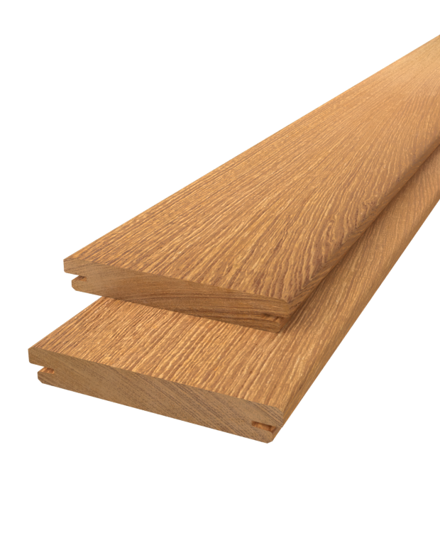 Deze plank wordt gebruikt voor buitenterrassen of gevelsystemen. Met behulp van speciale roestvrijstalen clips wordt dit profiel bijna onzichtbaar bevestigd, zodat er een strak terras of gevel ontstaat.