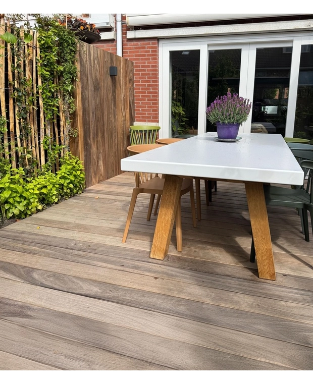 Padouk komt uit Afrika en het is een zeer duurzame en uitzonderlijk stabiele houtsoort. Het kent weinig werking en is relatief makkelijk te bewerken. Deze houtsoort heeft een dieprode kleur en zal uiteindelijk een prachtige zilvergrijs verweren.
