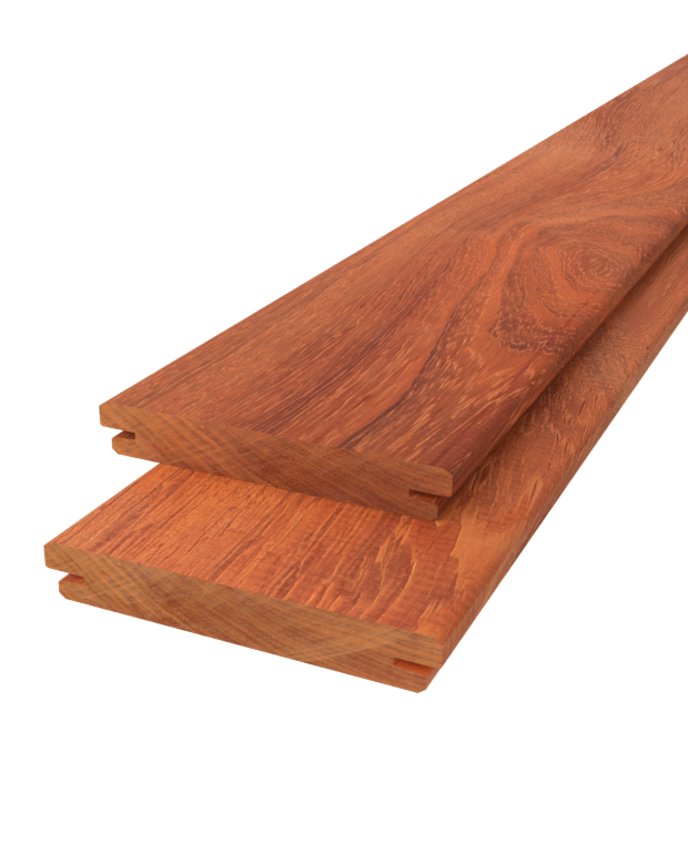 Deze hoogwaardige Padouk plank is perfect voor buitenvloeren en gevelbekleding. Met de onzichtbare bevestiging door middel van speciale roestvrijstalen clips creëer je een strak en modern uiterlijk, ideaal voor een stijlvolle en duurzame afwerking van je buitenproject.